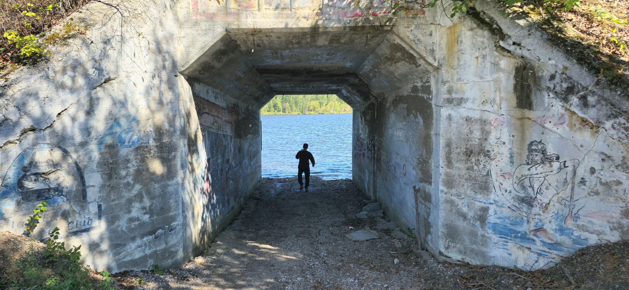We then headed to Mattawa for groceries. There's a Foodland, Dollarama, and Giant Tiger beside a free parking lot in the downtown area. Here we bought shrimp, salad, and cans of stew. We put the food in the car and walked over to a bushy area with elevated train tracks. Advancing towards the brush revealed a tunnel underneath the tracks.