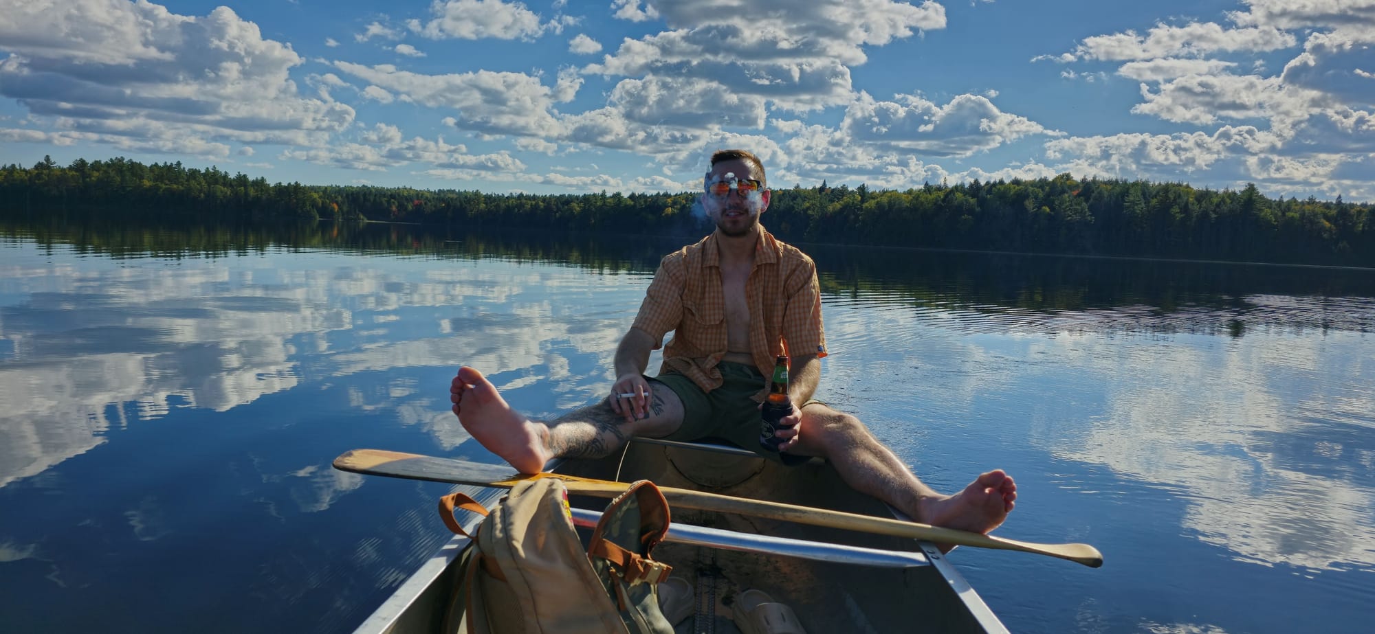 It's our last day here and we haven't been on the water. We headed to Algonquin Outfitters right as we woke for their first come first serve day rentals. The lakeside store is ran by an old couple, Jake and Bonnie Pidgeon, and their dog Gus. Apparently Jake, who is 87, still regularly portages through Algonquin. From his dock, he watches people on the lake, ready with his Jon boat in case of aquatic emergency. We paddled the canoe from the AO dock to the main dock near Portage Launch #1, where we left our canoe and equipment on the shore, next to another canoe. This belonged to Mike, a regular of Algonquin who hosts expedition trips throughout the area. The fog was still thick and we hadn't ate, so we headed for breakfast at the campsite.